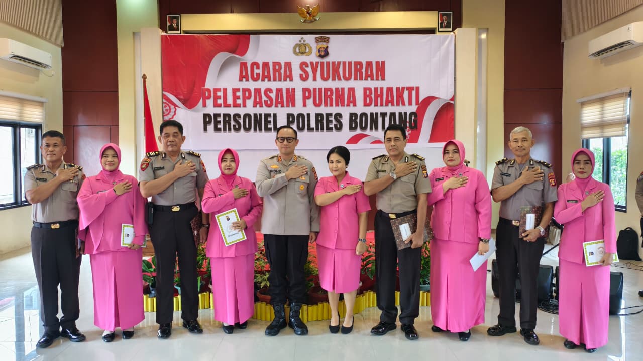 Bonntang – Senin,, 08/12/2025, pukul 09.00 Wita, bertempat di Aula Wicaksana Laghawa Polres Bontang, telah dilaksanakan kegiatan Pelepasan Purna Bakti Personil Polres Bontang yang telah memasuki masa pensiun. Kegiatan ini dihadiri oleh Kapolres Bontang, AKBP Widho Anriano, S.I.K, M.Si, Ketua Bhayangkari Cabang Bontang, Ny. Vara Widho, serta para pejabat utama Polres Bontang dan personil lainnya.